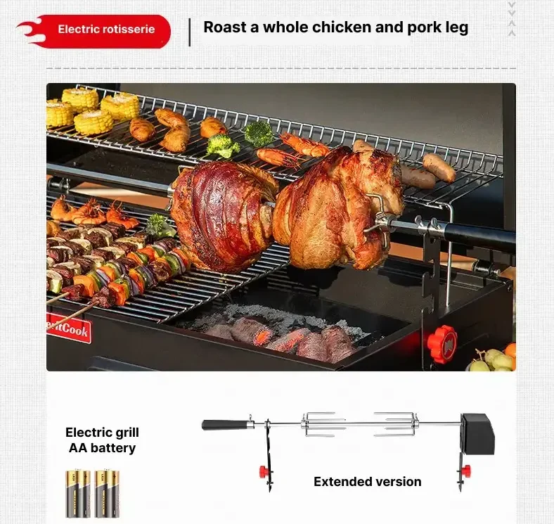 The Electric Rotisserie offers a seamless grilling experience with its simple installation and quick start functionality. Designed for convenience, it is compatible with furnaces featuring a width within 34.7 inches, ensuring versatility in usage. Powered by AA batteries, this rotisserie eliminates the need for complicated wiring or external power sources, making it highly portable and user-friendly. Its innovative design allows for easy assembly, enabling users to start grilling their favorite meats and vegetables in no time. With the Electric Rotisserie, users can enjoy perfectly cooked, evenly roasted dishes with minimal effort. Whether it’s succulent rotisserie chicken, tender roasts, or flavorful kebabs, this accessory adds versatility and convenience to any grilling setup, making outdoor cooking a breeze.